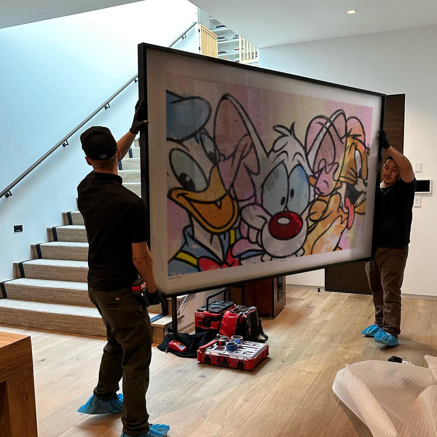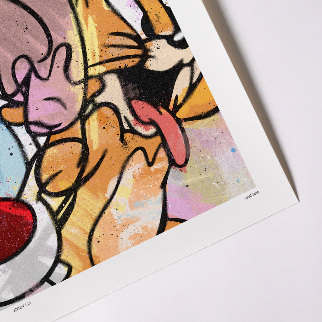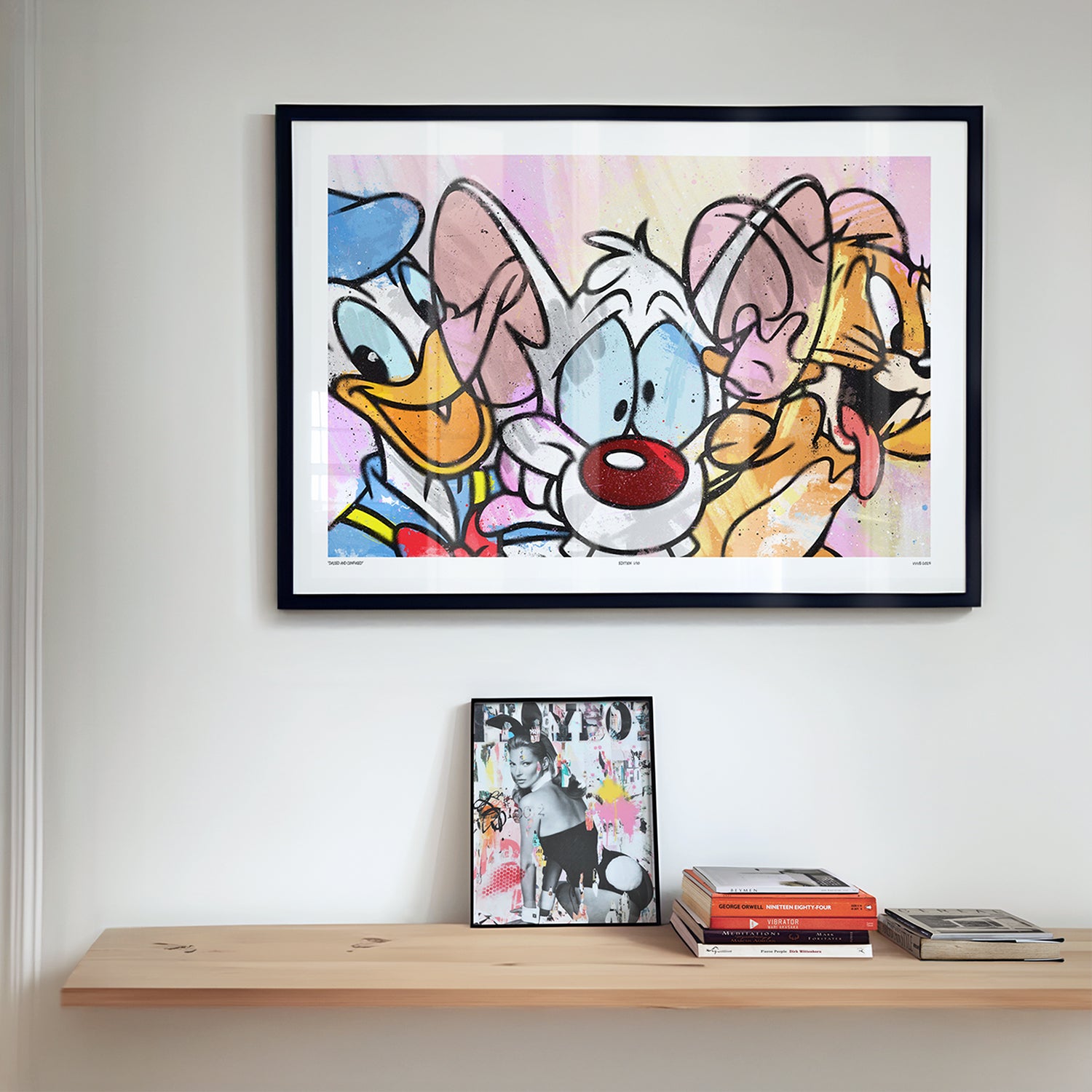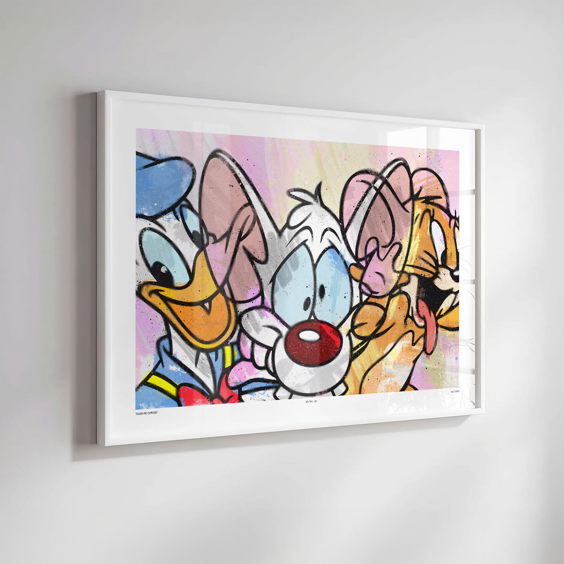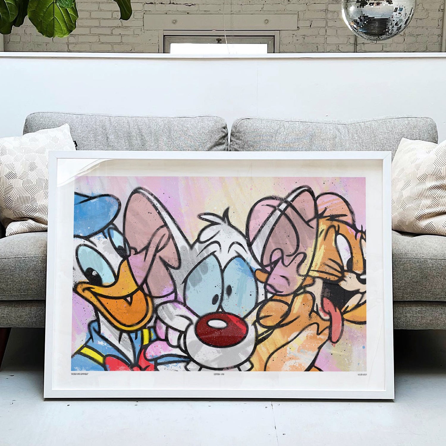 This vibrant and playful piece brings together Donald Duck and other iconic characters, blending pop art with a gritty, urban aesthetic to create a modern, energetic take on classic cartoon imagery.