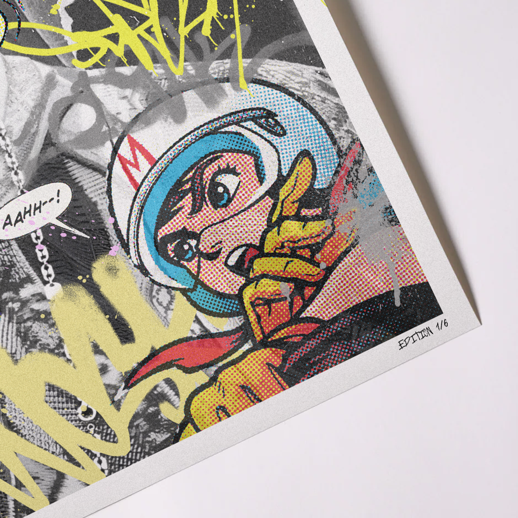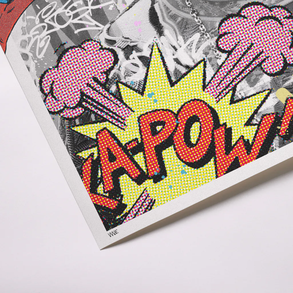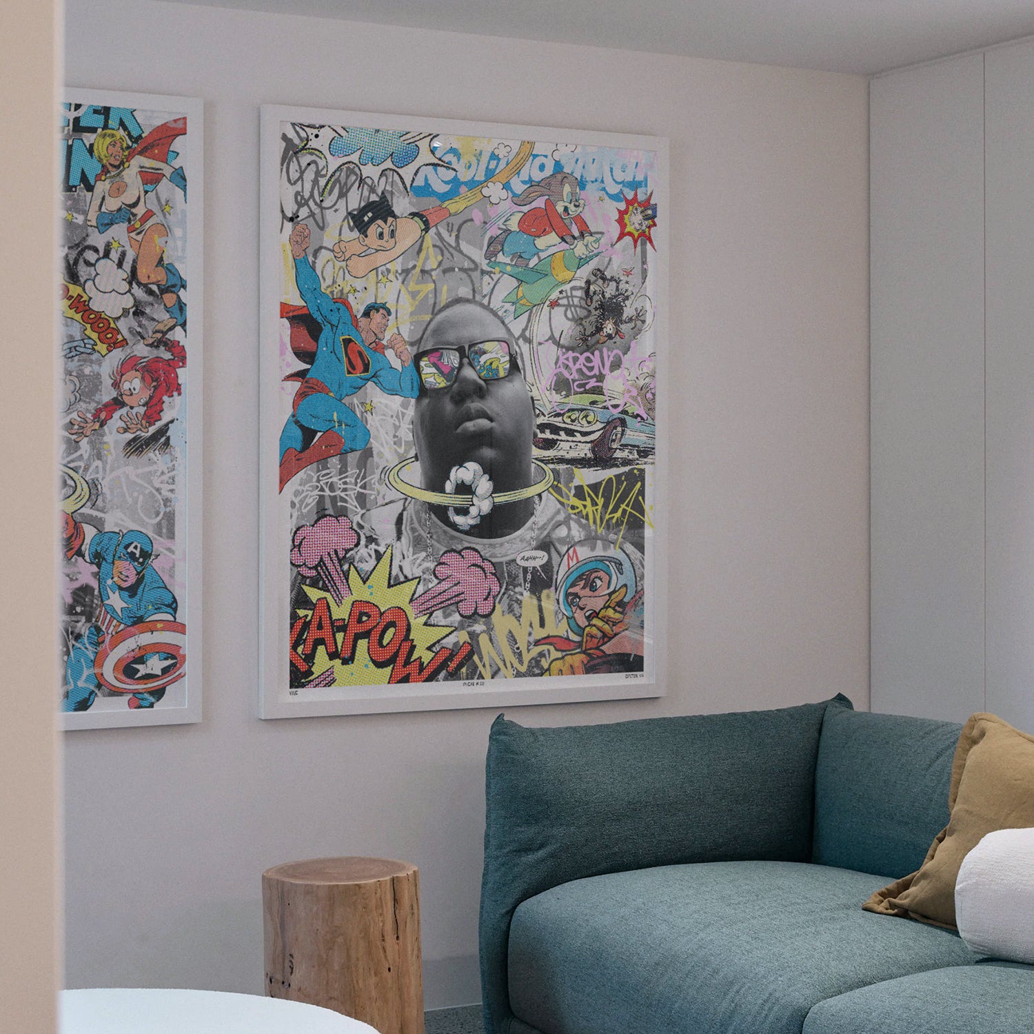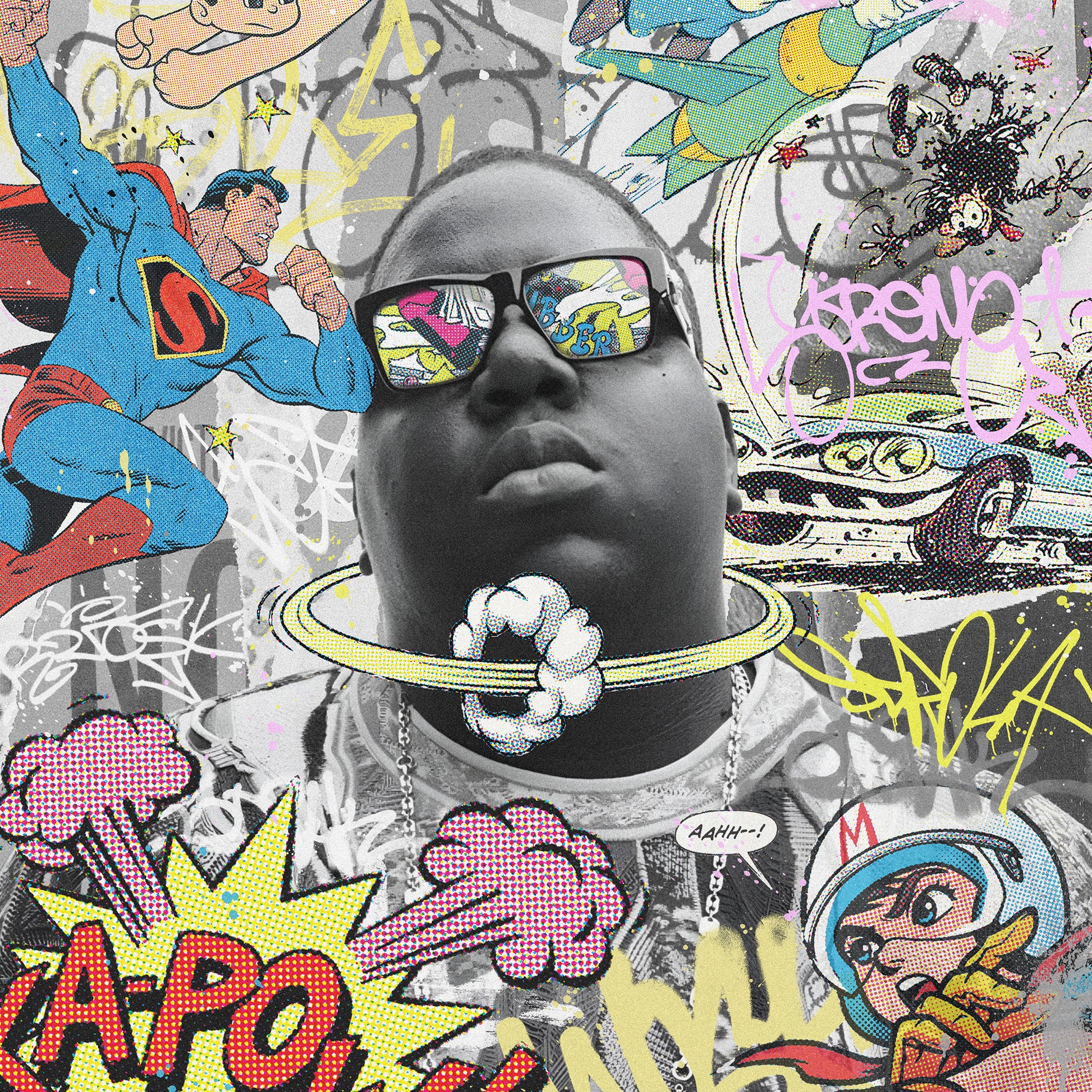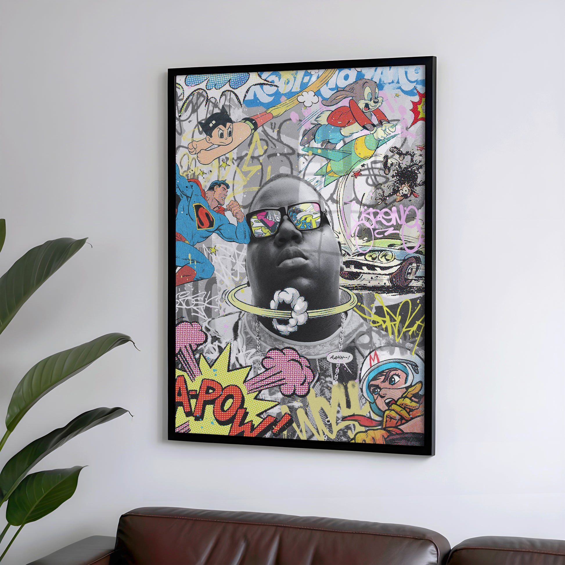 A dynamic blend of comic art and pop art, this piece combines iconic characters and graffiti into a vibrant, curated chaos; a bold tribute to classic comics and Biggie Smalls, reimagined through layered collage work.
